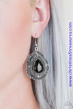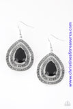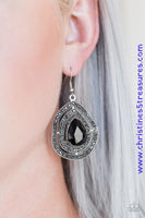 A dramatic black teardrop gem is pressed into the center of a rippling silver frame radiating with glittery hematite rhinestones for a regal look. Earring attaches to a standard fishhook fitting. Sold as one pair of earrings.