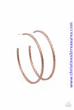 Etched in a subtle slanted texture, a dainty copper hoop delicately curves around the ear in a rustic finish. Earring attaches to a standard post fitting. Hoop measures approximately 2” in diameter. Sold as one pair of hoop earrings.