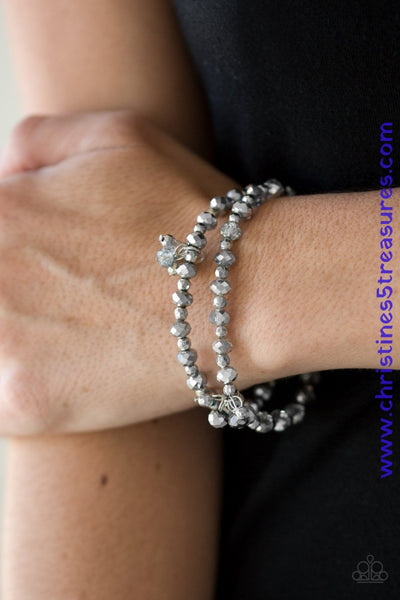 Hematite and smoky crystal-like beads and faceted silver beads are threaded along stretchy elastic bands. Matching gunmetal beads swing from the wrist, creating clustered centerpieces. Sold as one set of two bracelets.