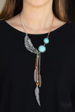 Fastened together with an assortment of silver chains and pieces of earthy brown leather, a whimsical collection of turquoise stone frames and brass, copper, and silver feather charms join below the collar, creating a wild wanderlust fringe. Features an adjustable clasp closure. Sold as one individual necklace. Includes one pair of matching earrings.