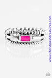Featuring ropelike, smooth, and dotted textures, three glistening silver bars layer across the finger. Painted in a vivacious hue, a bright pink frame is pressed into the centermost band for an edgy finish. Features a dainty stretchy band for a flexible fit. Sold as one individual ring.