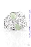 Shimmery silver frames, glassy white rhinestones, and glowing green moonstones coalesce across the finger, creating a bubbly frame. Features a stretchy band for a flexible fit. Sold as one individual ring.