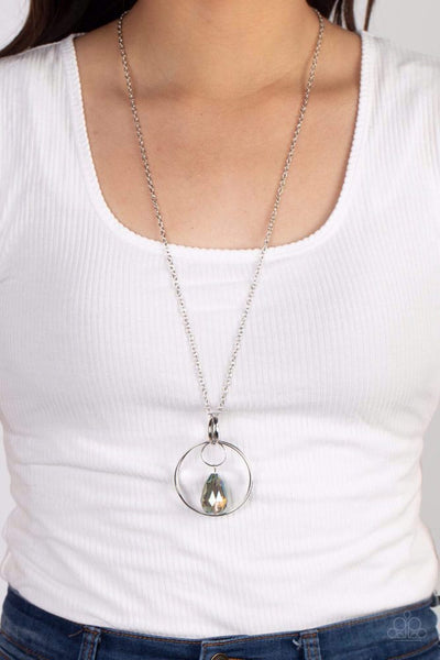 An oversized faceted teardrop in a green iridescent shade swings from a mismatched collection of interconnected silver rings at the bottom of an extended silver chain for a spellbinding finish. Features an adjustable clasp closure. Due to its prismatic palette, color may vary. Sold as one individual necklace. Includes one pair of matching earrings.
