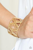 Featuring metallic textile patterns, a collection of abstract gold frames are threaded along stretchy bands around the wrist for a bold tribal inspired look. Sold as one individual bracelet.