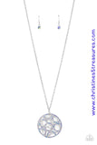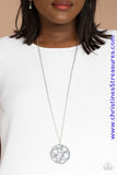 Overlapping silver rings and iridescent rhinestone encrusted circular frames coalesce into a glittery medallion at the bottom of a lengthened silver chain. Features an adjustable clasp closure. Sold as one individual necklace. Includes one pair of matching earrings.