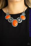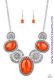 Flat orange beads connect with shimmery silver floral frames below the collar, creating a colorful medallion-like statement piece with a vintage inflection. Features an adjustable clasp closure. Sold as one individual necklace. Includes one pair of matching earrings.