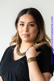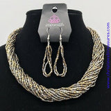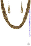 Strands of glistening brass seed beads subtlety twist below the collar, coalescing into a blinding shimmer. Features an adjustable clasp closure. Sold as one individual necklace. Includes one pair of matching earrings.