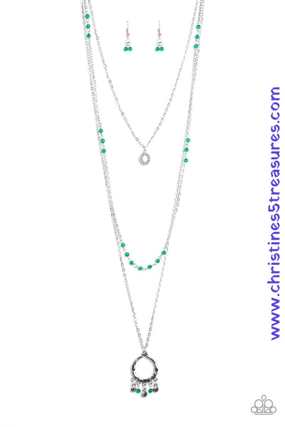 Infused with sporadic sections of dainty green crystal-like beads, three dainty silver chains layer down the chest. A dainty silver frame swings from the uppermost chain, while a hammered pendant featuring coin-like charms and green crystal-like beads swings from the lowermost layer. Features an adjustable clasp closure. Sold as one individual necklace. Includes one pair of matching earrings.