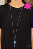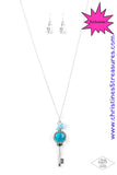 A luminescent blue cat's eye stone is pressed into a silver key charm, creating a colorful pendant. Infused with iridescent blue cat's eye beading, the silver key is encrusted in glittery white rhinestones for a dazzling finish. Features an adjustable clasp closure. Sold as one individual necklace. Includes one pair of matching earrings.