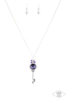 A luminescent purple cat's eye stone is pressed into a silver key charm, creating a colorful pendant. Infused with iridescent purple cat's eye beading, the silver key is encrusted in glittery white rhinestones for a dazzling finish. Features an adjustable clasp closure. Sold as one individual necklace. Includes one pair of matching earrings.