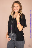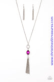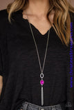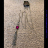 A white rhinestone encrusted ring, oval pink rhinestone, and shimmery silver chain tassel dangle from the bottom of a lengthened silver chain, creating a glamorous statement. Features an adjustable clasp closure. Sold as on individual necklace. Includes one pair of matching earrings.