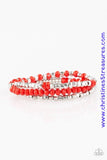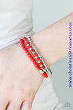 A mishmash of faceted red and silver beads are threaded along stretchy elastic bands, creating colorful layers across the wrist. Sold as one set of 3 bracelets.